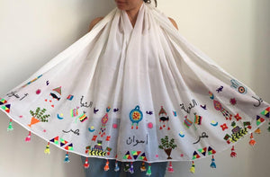 The Aswan Shawl is inspired by the colors and symbols found on modern Nubian houses. It can brighten up any look and will brighten up your day to wear it!