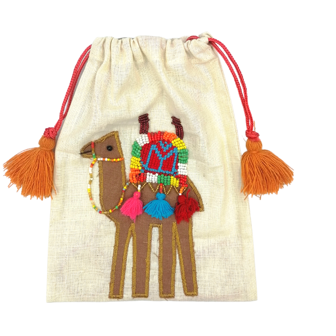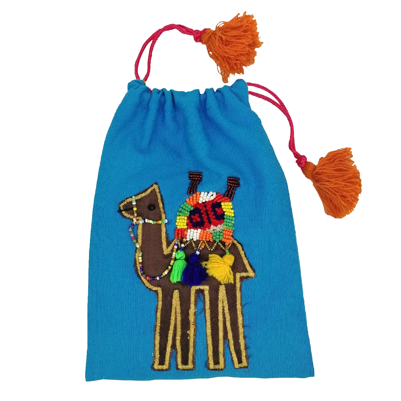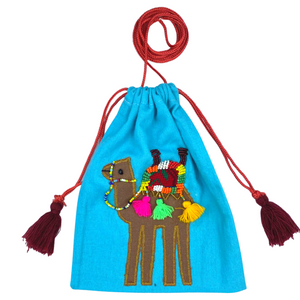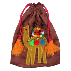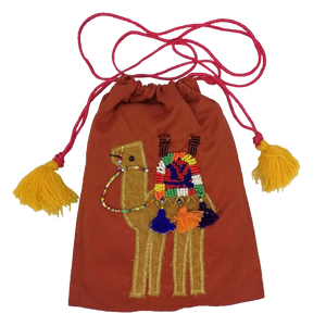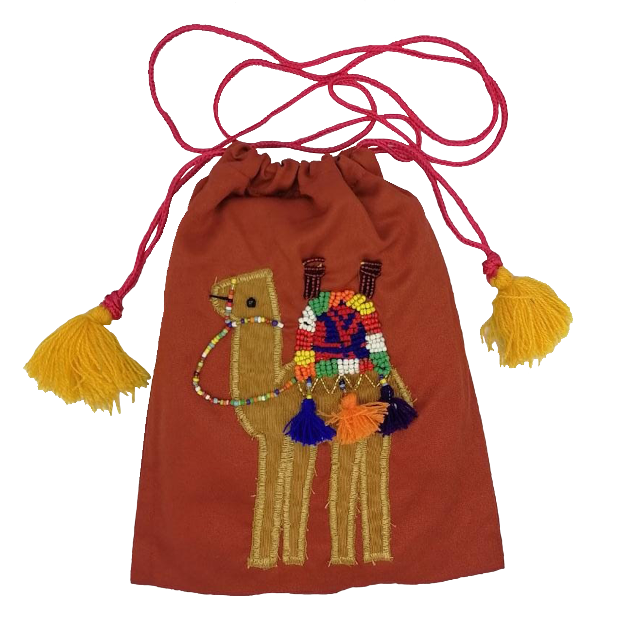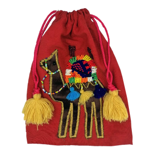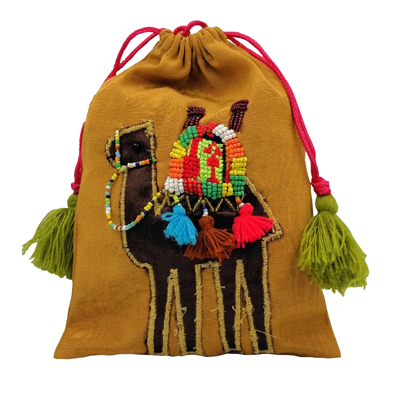 A pouch with hand embroidery from North Sinai, Tassels from Aswan, and Egyptian fabric. Comes with a long strap.