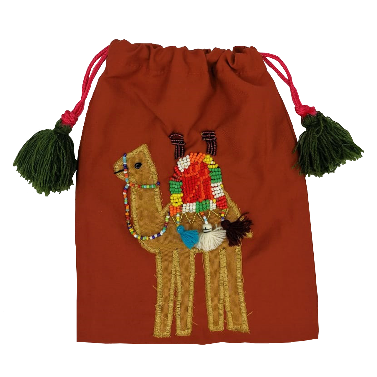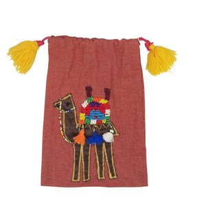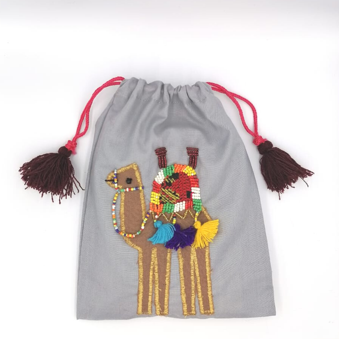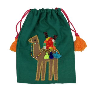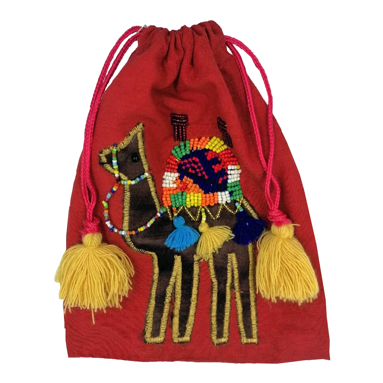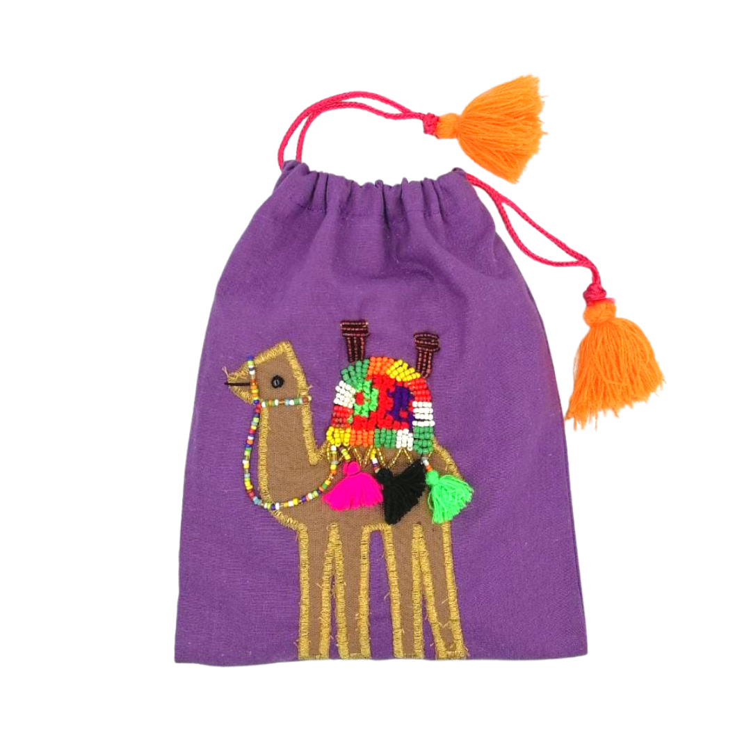 A pouch with hand embroidery from North Sinai, Tassels from Aswan, and Egyptian fabric. Comes with a long strap.