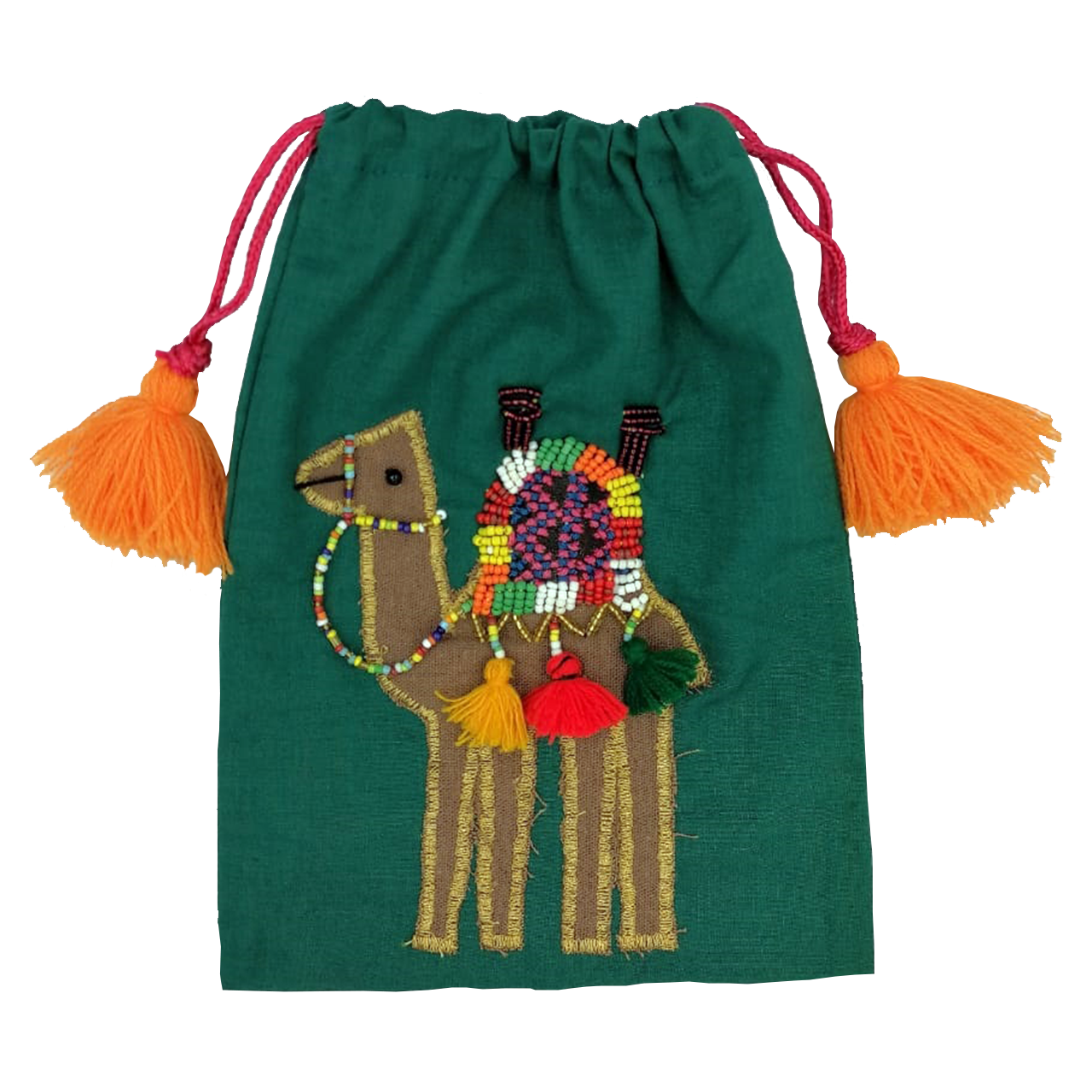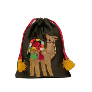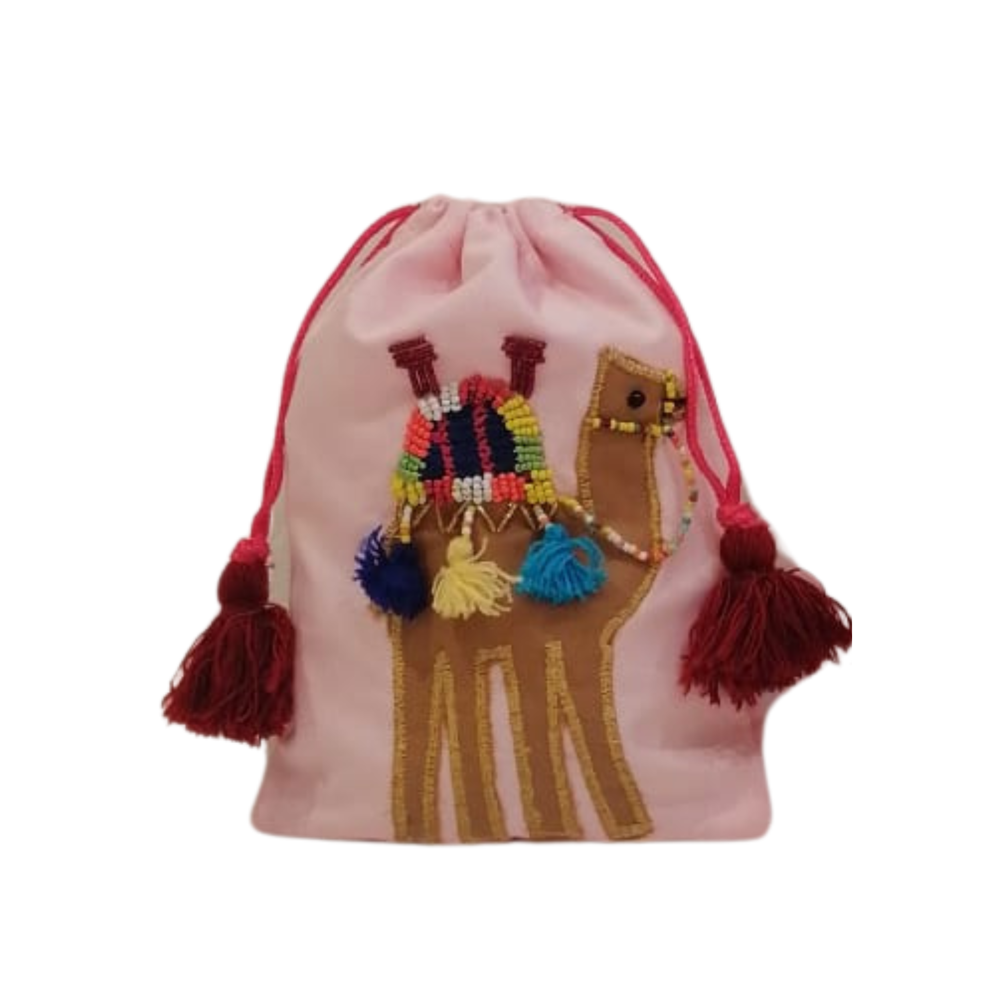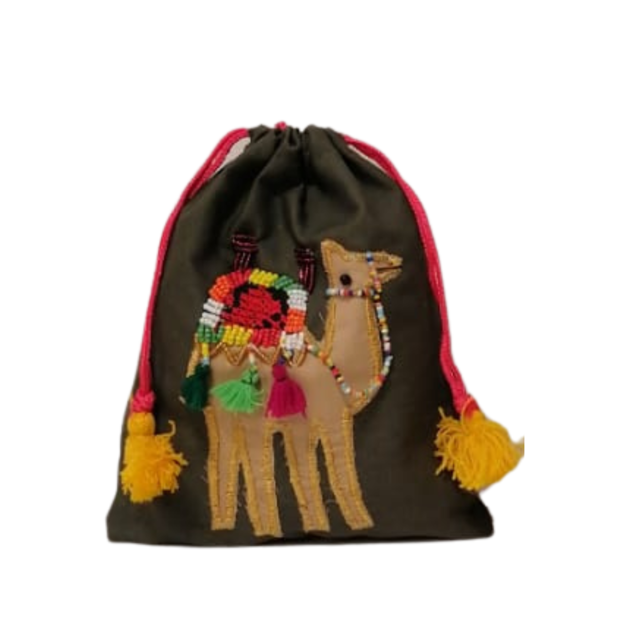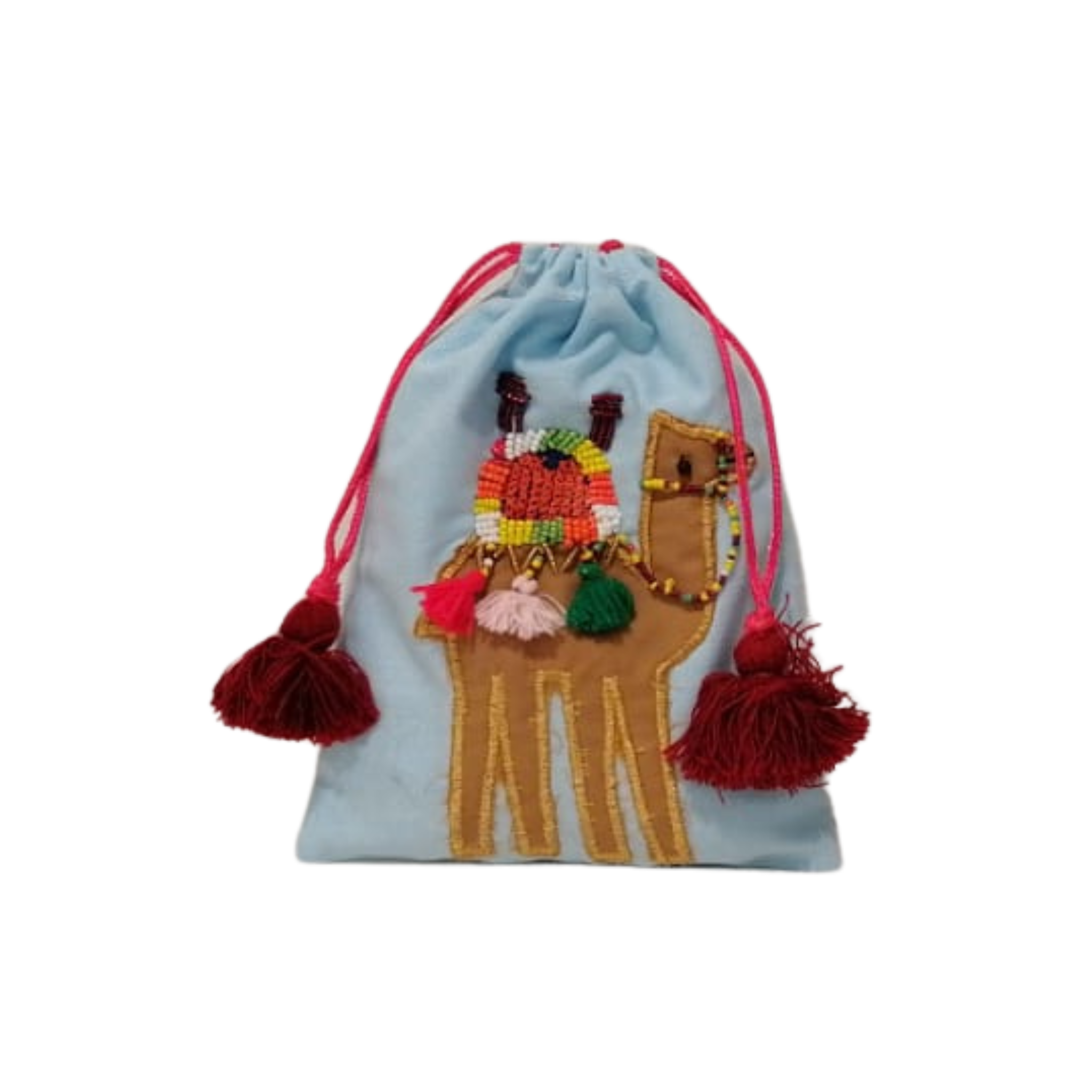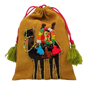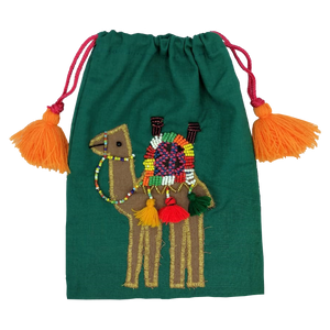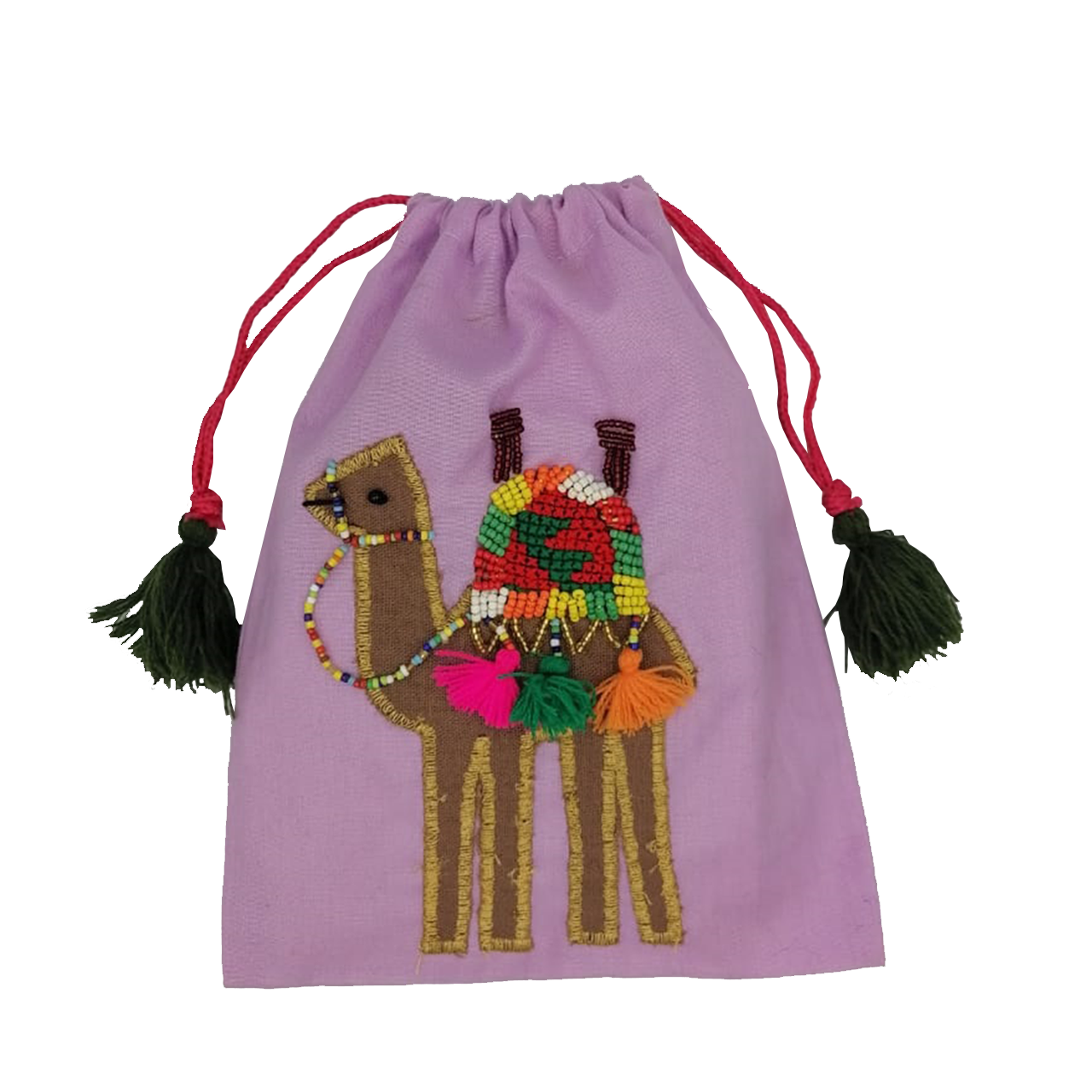 A pouch with hand embroidery from North Sinai, Tassels from Aswan, and Egyptian fabric. Comes with a long strap.