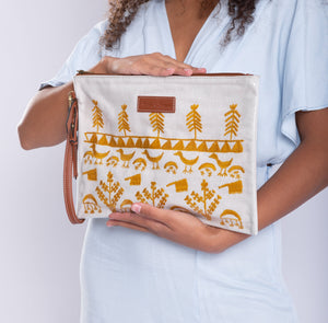 Contemporary Hand Embroidery inspired by the Nubian symbols from Upper Egypt, on cotton covered in plastic with vegan leather handle.