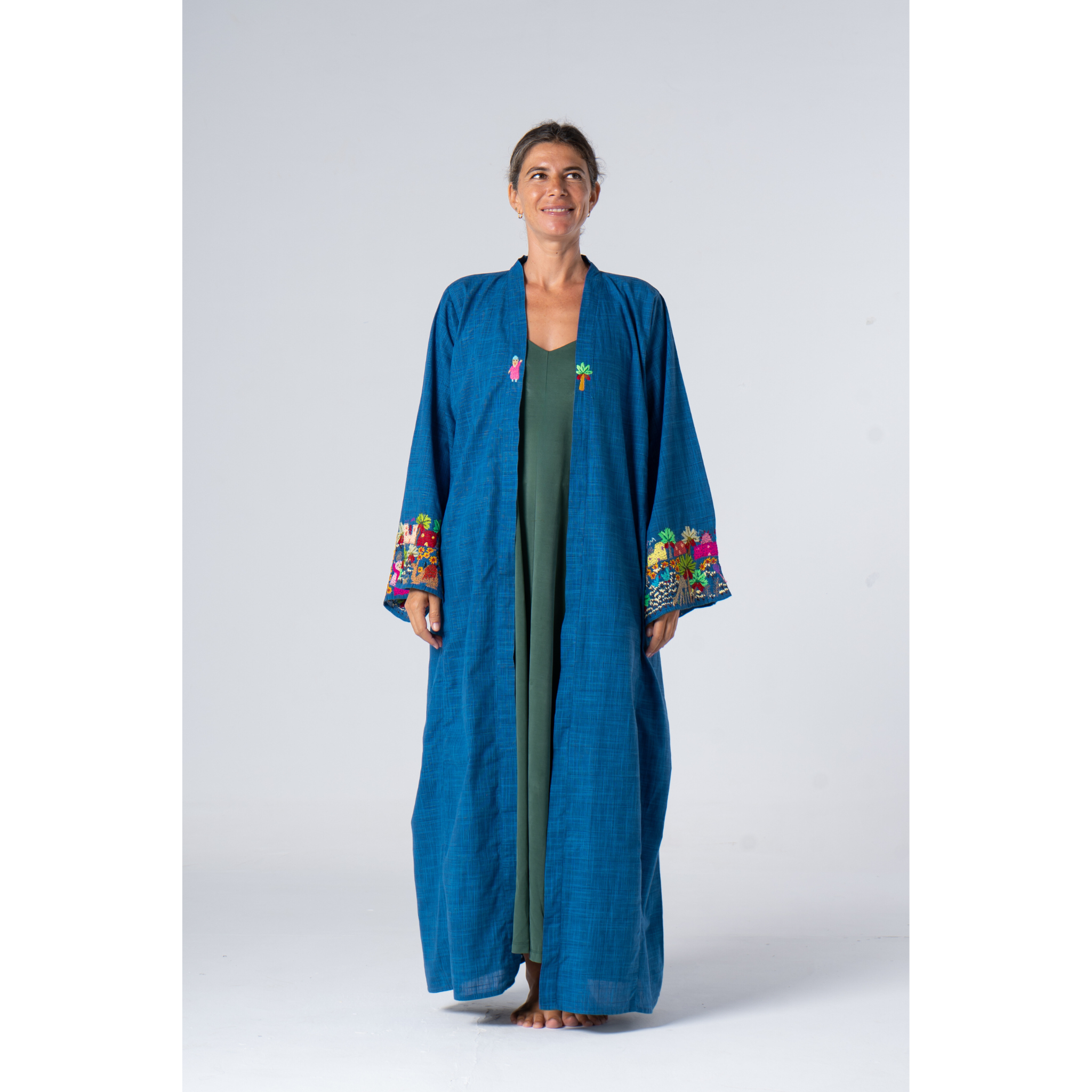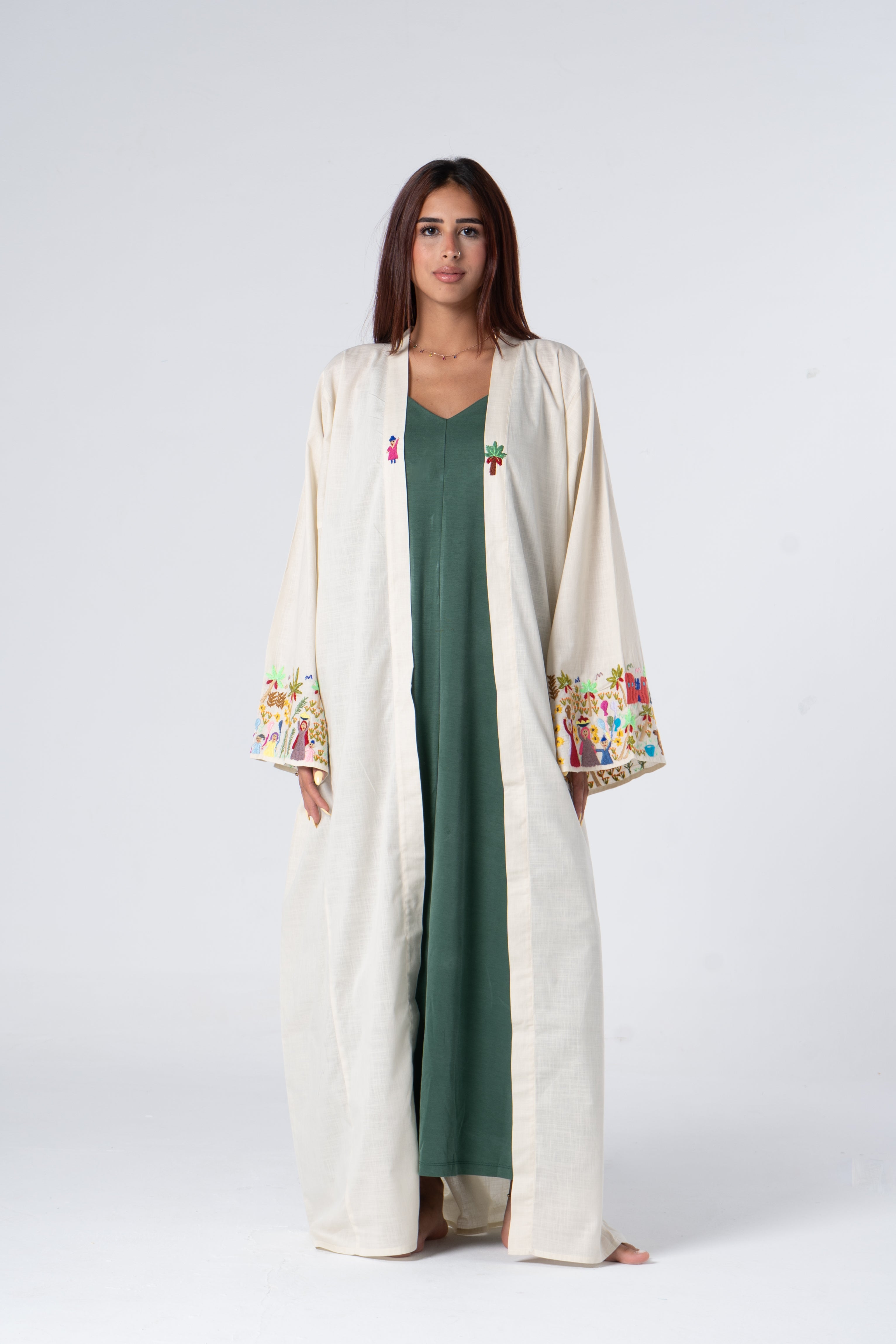 Kaftan with Fellahy embroidery depicting scenes from the Egyptian countryside. Nevin was inspired to create the Fellahy design through her travels through the Nile Delta. She hand draws the scenes of daily life on the fabric which is then embroidered by the women on our team who live and work from all corners of Egypt.
