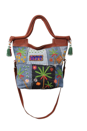 Contemporary and traditional embroidery on a patchwork jeans and leather bag with tassels from Aswan.