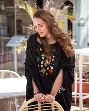 A matching Galabeya and Shawl with fellahy embroidery depicting scenes from the Egyptian countryside.