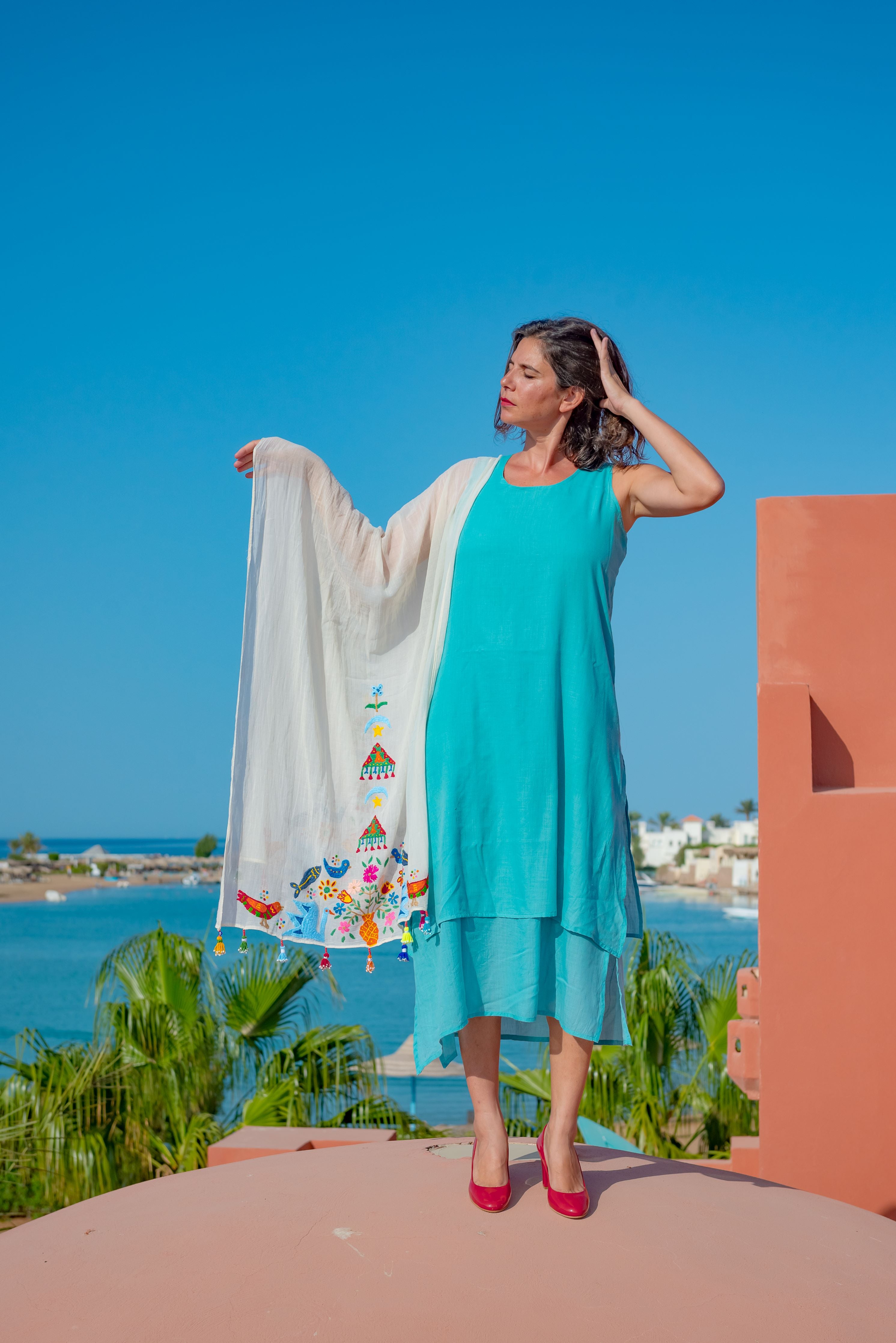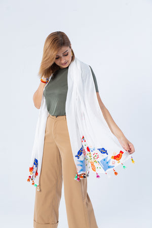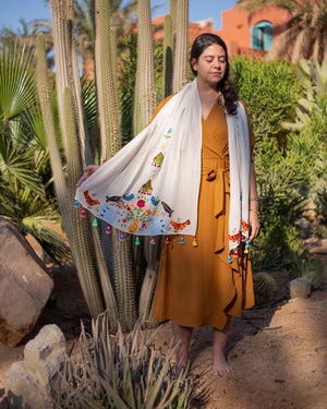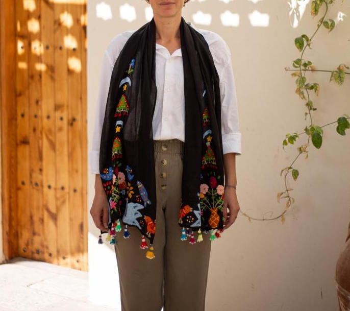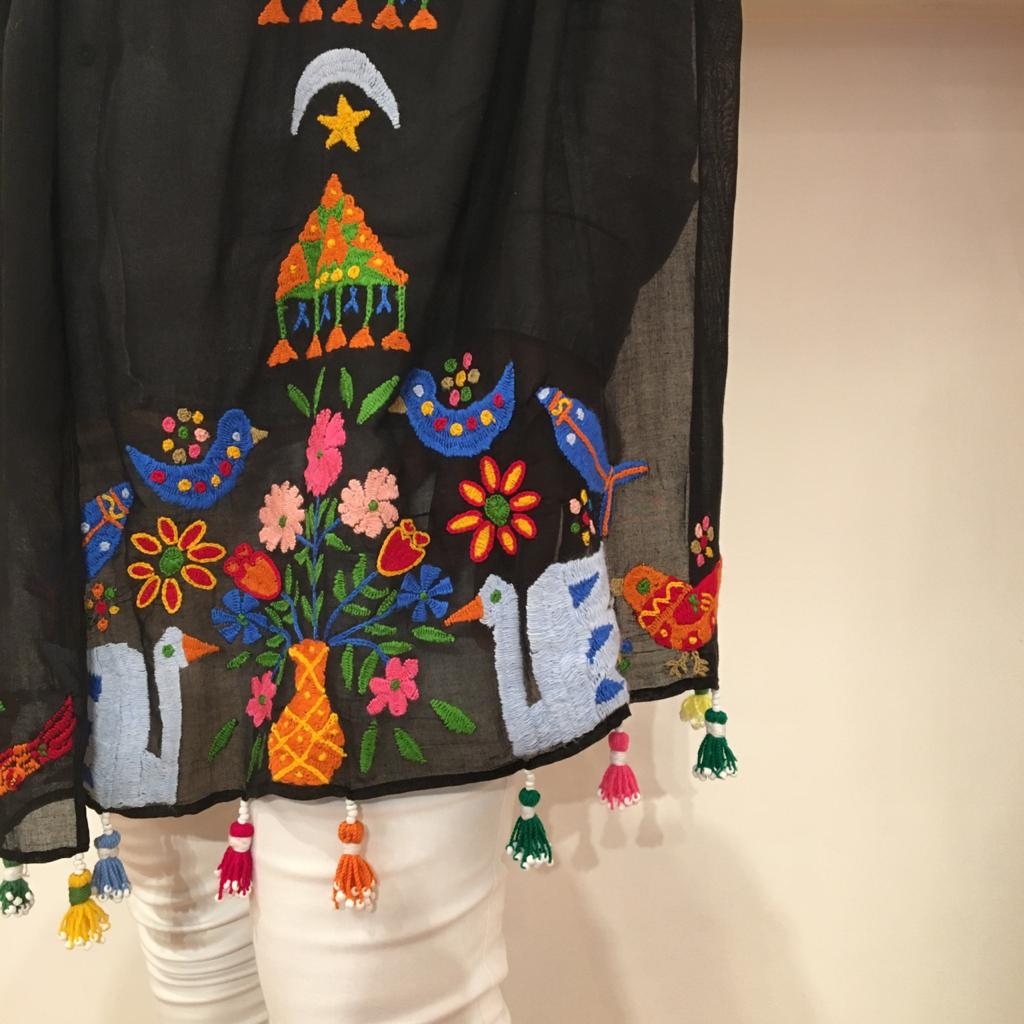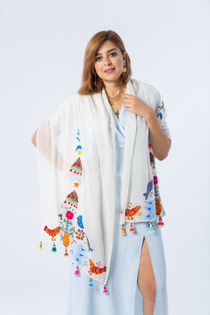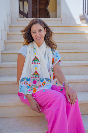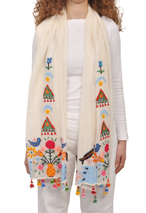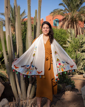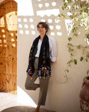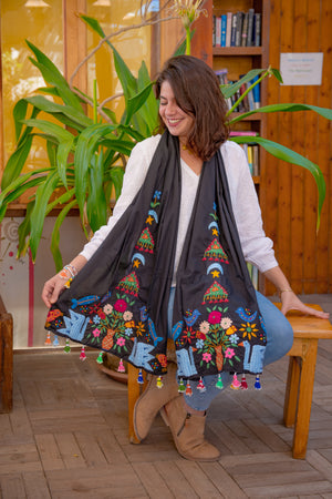 Our unique contemporary hand embroidery design on a soft cotton shawl with our signature hand rolled tassels.
